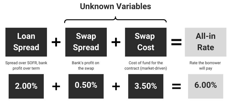 When reviewing your bank’s proposal and, later, the loan documents, the loan spread - the bank’s profit from the loan - is usually easy to spot. For instance, the bank may state your interest rate as Term SOFR (the floating rate index) + 2.00%, meaning their profit margin on the loan is 2%. If you choose not to enter an interest rate swap, your loan would float based on this index plus a 2% spread.