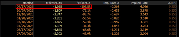Heading into the meeting, the market had predicted a small chance of a double cut (50-bps), generally between 4 and 8% (~5.8% as pictured below); the market generally does this as a “just-in-case” type of scenario. The chance of a single cut was definitively priced in and a forgone conclusion (e.g., “base case”).