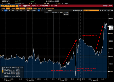 When the Fed delivered the base case (25-bps), traders took out that tiny probability of a bigger move. With the “double-cut” scenario off the table (for now), the curve repriced, and the 10-year yield moved up immediately after the decision.