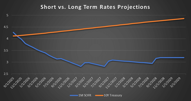 On September 17, 2025, the Federal Reserve delivered a widely expected 25-basis points (“bps”) cut, setting the federal funds target range at 4.00%–4.25%. This was the first easing since last December. Intuitively, many Borrowers might have thought the move would have brought relief to long-term rates. E.g., if rates were cut 25-bps, my 10-year term loan pricing should have gone from 5.00% to 4.75%. In the words of the legendary Lee Corso, “not so fast, my friend!”
